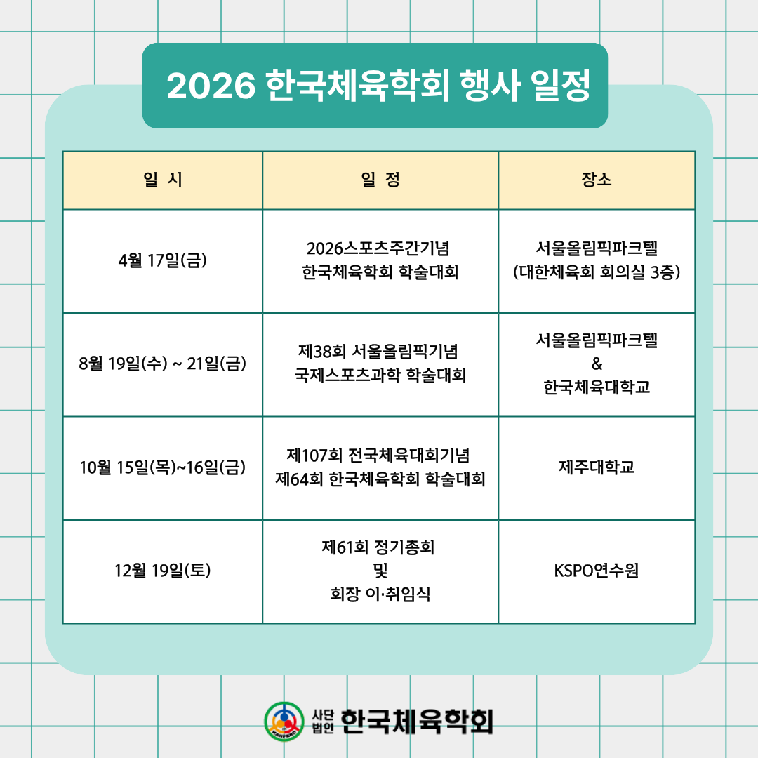2026년도 한국체육학회 주요 행사 일정(안)을 아래와 같이 공유드립니다.