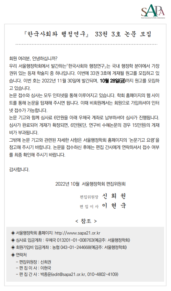 [서울행정학회][기간연장] 『한국사회와 행정연구』 33권 3호 논문 모집