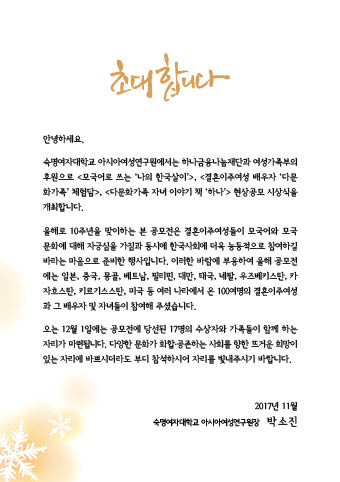 숙명여자대학교 아시아여성연구원에서는 지난 2007년부터 <결혼이주여성 모국어로 쓰는‘나의 한국살이’체험담 현상공모> 사업을 수행한 바 있습니다. 2017년에는 <모국어로 쓰는 '나의 한국살이' 체험담> 현상공모 뿐만 아니라 <결혼이주여성 배우자 '다문화가족' 체험담>, <다문화가족 자녀 이야기책 ‘하나’ 만들기> 현상공모전까지 확대 실시하였습니다.