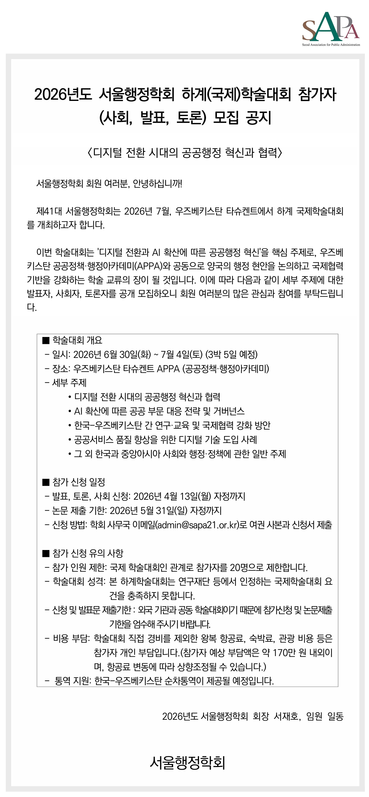 2026 서울행정학회 하계국제학술대회 참가자(사회, 발표, 토론) 모집 공지